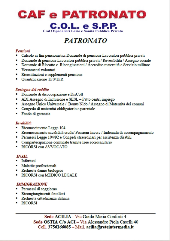• Consulenza su indennità e invalidità: Offrire consulenza per la richiesta di indennità di disoccupazione, indennità di maternità, malattia e invalidità, e aiutare i lavoratori a ottenere il riconoscimento delle prestazioni assistenziali a cui hanno diritto.